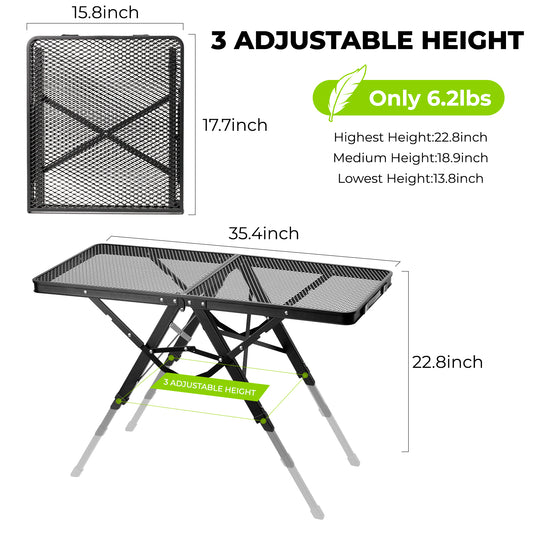 Camping Grill Table, Aluminum Folding Picnic Table with 3 Level Height and Mesh Desktop
